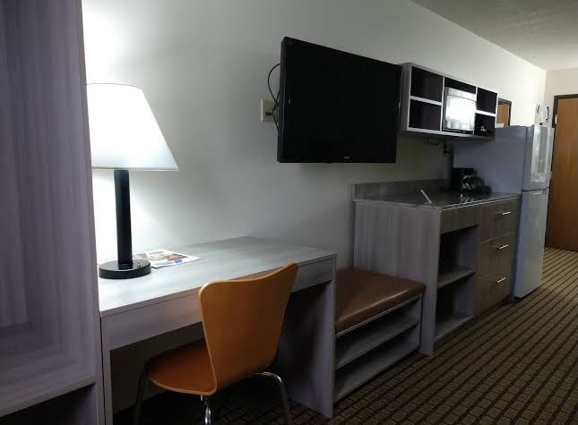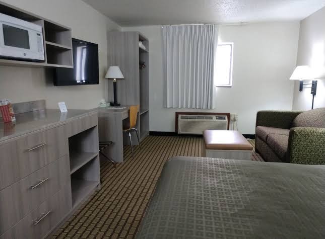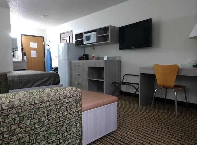 For a cheap ‘extended stay’ this place isn’t bad. I have a queen bed, a pull out couch and recliner it’s not a bad living space. The room comes with a small full sized fridge freezer, a full sized desk and tons of storage space. My only two complaints (which admittedly are minor) are I wish the closet was a bit bigger and I wish the dresser wasn’t under the kitchen counter. The place comes with a small hot plate and a microwave oven. For the money this place is pretty great. The tv is on a nice swivel mount so you can adjust it to see it from anywhere in the room, which is pretty nice too.